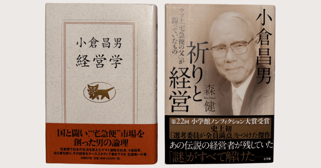 その第1回はこの2冊。左側のは宅急便を始めたヤマト運輸の小倉昌男さんの著書『経営学』(1999、日経BP社)。右側のはその小倉さんの晩年について緻密で真摯な取材に基づいて書かれたノンフィクション『小倉昌男 祈りと経営』(2016、小学館)。